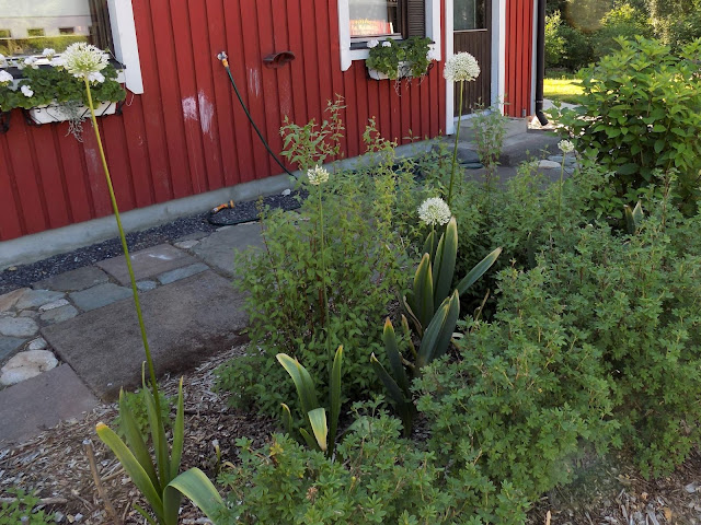 | Lemmikkejä vasten pallolaukan kukinnot näyttävät likaisenhaalelta ja värittömiltä. Ehkä ensi vuonna ne ovat edustavammassa ympäristössä. |