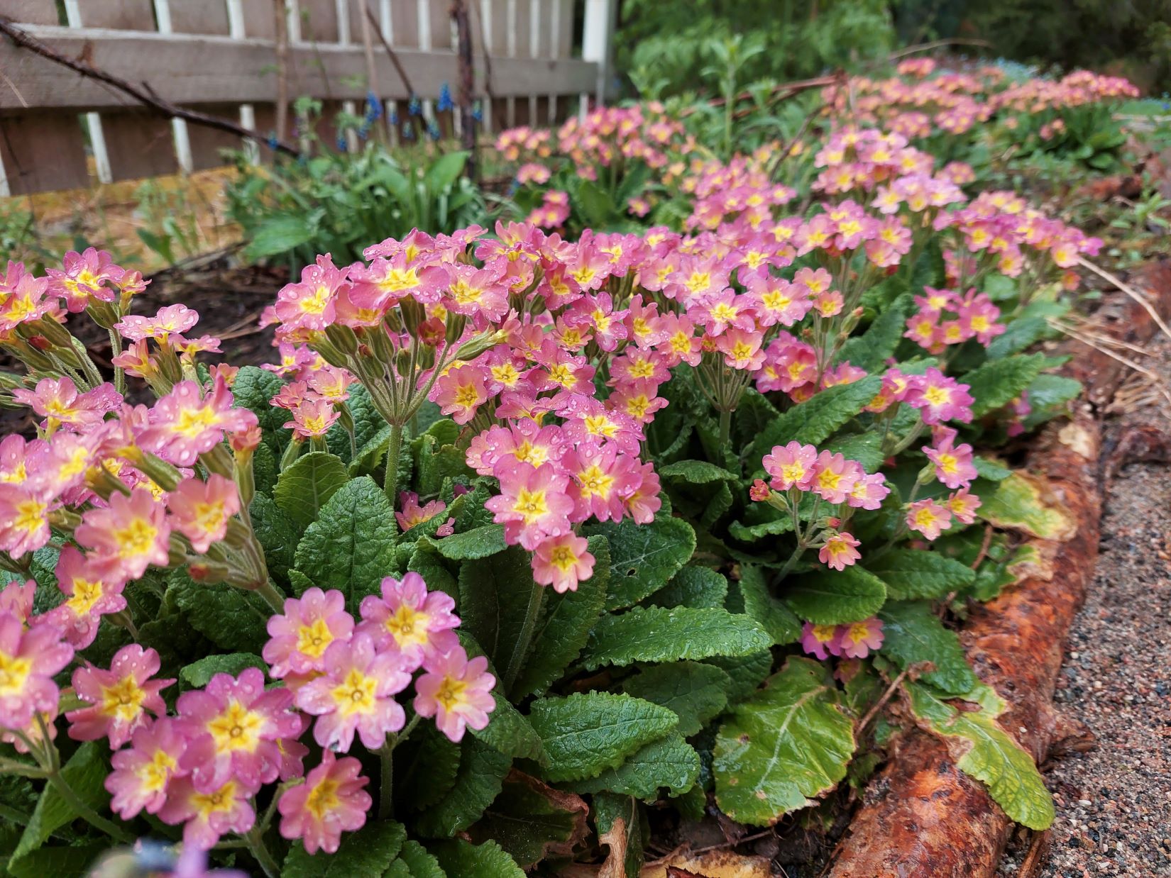 Varjokujalta puikahdamme talon nurkan taakse takapihalle. Esikoita löytyy valkean varjopenkin reunasta oikein pitkä rivi ja lisää luumutarhasta ja grillikatoksen takaa varjopenkistä. Luumutarhaan on tulossa lisääkin esikoita, sillä istutin siemenkirjeestä saamani esikontaimet nuotiopaikan lähelle viime syksynä tehtyyn laajennukseen. Taimet ovat vasta parisenttisiä, joten kukkakuvia saan esitellä niistä ehkä vuoden päästä.